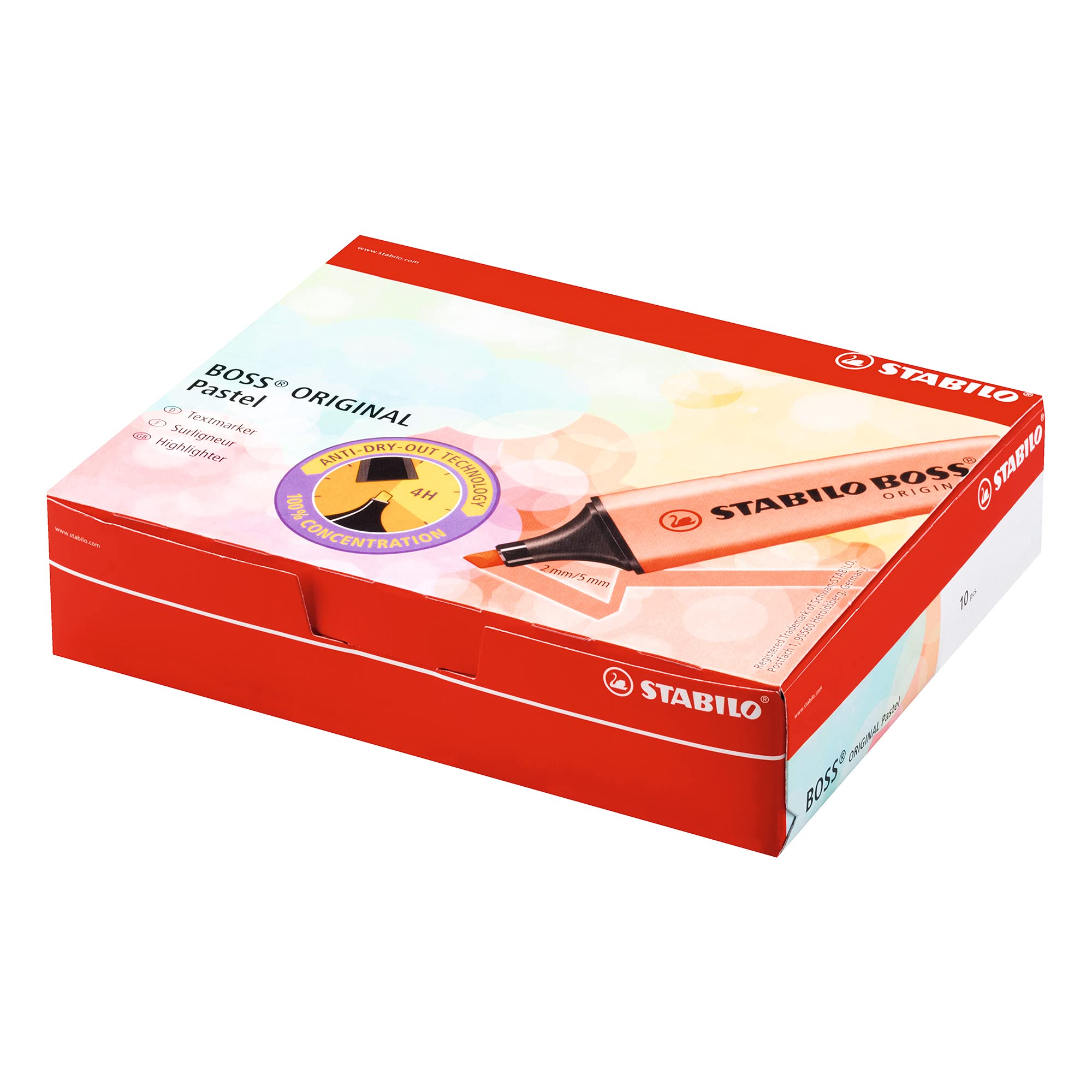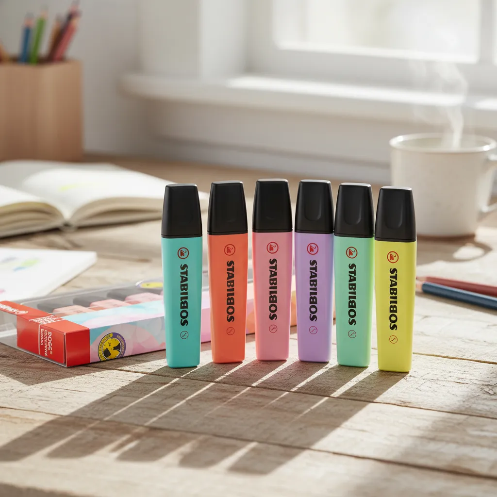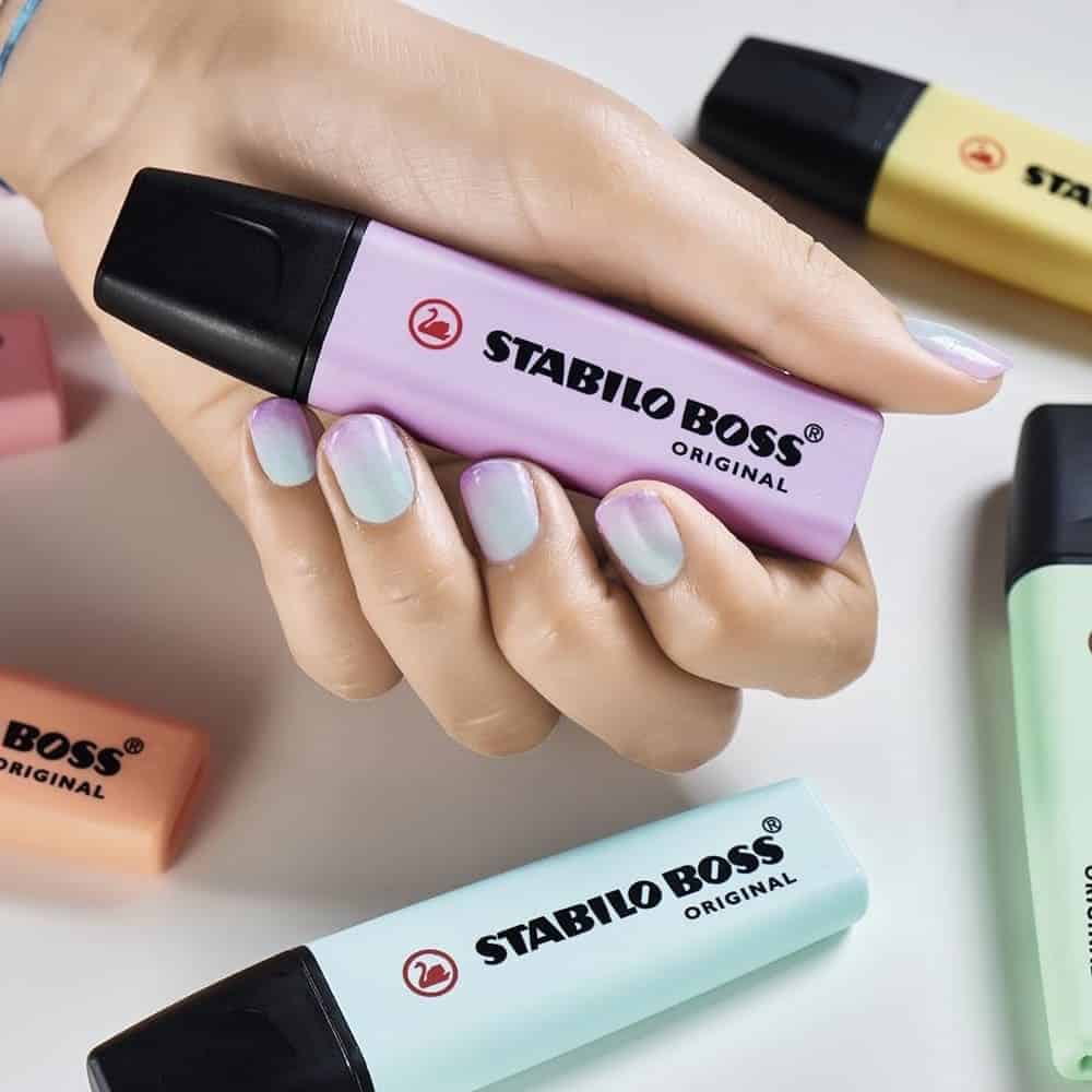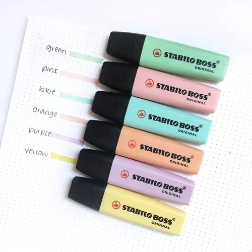 Tinta a base de agua, destaca sobre todo tipo de papel. Su punta biselada permite trazos en 2 y 5 mm. Diferencial Stabilo: no te preocupes si lo dejaste destapado (hasta 4 horas), ponle la tapa nuevamente y continuará destacando como siempre.