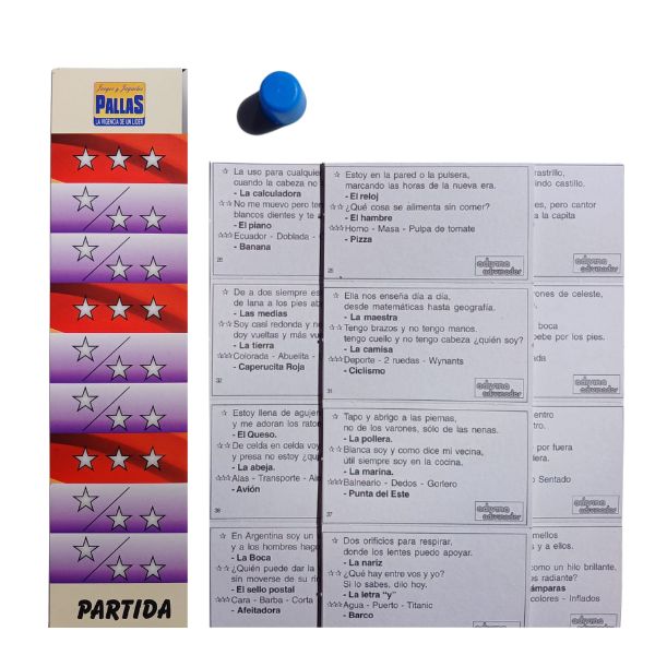 • Contiene: 48 tarjetas de adivinanzas, 1 tablero de juego, 1 block para anotar, 1 lapiz con goma y las instrucciones.