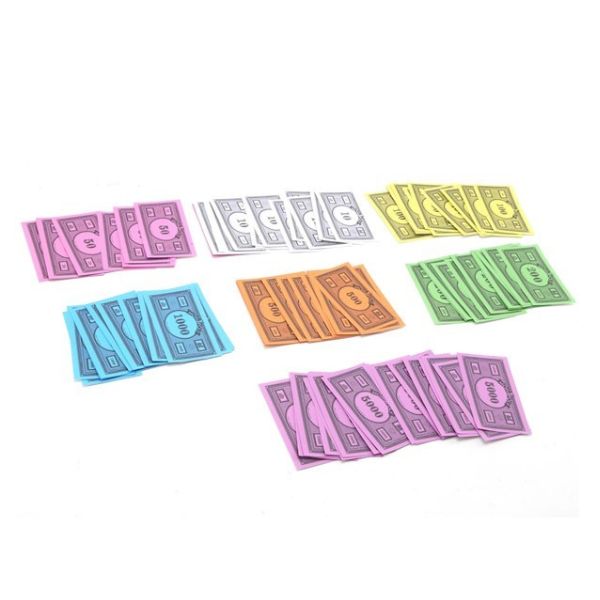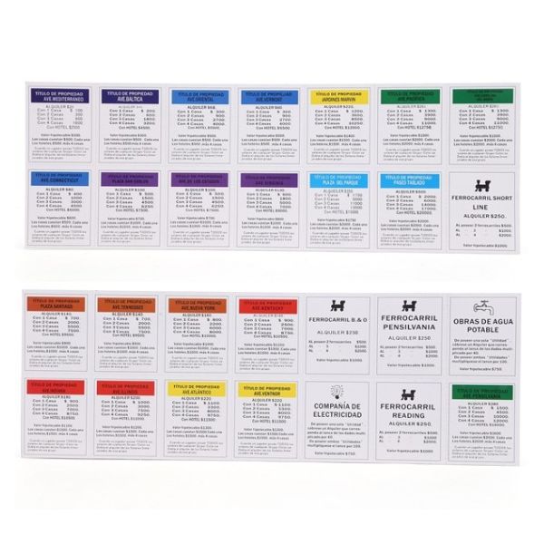 • Contiene: 1 tablero, 22 titulos de propiedades, 6 companias, 15 cartas de casualidad, 15 cartas de arca comunal,  billetes ($10, $50, $100, $200, $500, $1000 y $5000), 2 dados, 32 casas, 8 fichas, 12 mansiones y una base para poner el dino del banco.