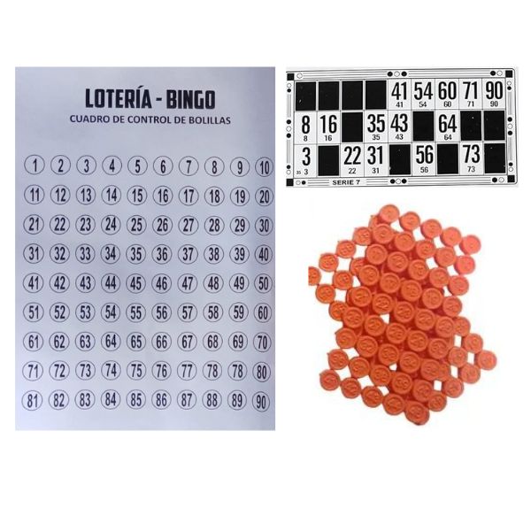 - Contiene: 90 bolillas plásticas (rojas), 1 bolsa de papel para bolillas, 1 cuadro de control de bolillas y 24 cartones de juego.