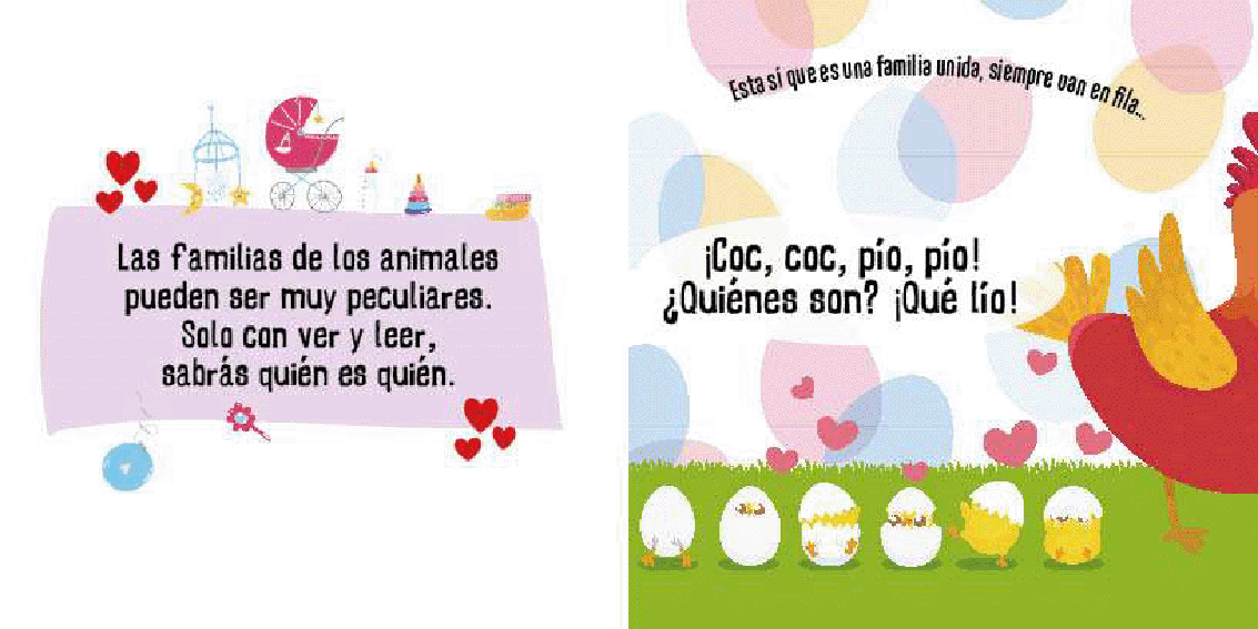 Estos libritos están llenos de sorpresas. En cada página, un animalito propone un pequeño reto: ayudándose de la rima y de los coloridos dibujos, los más peques deberán averiguar quie familia es. Hay familias grandes y pequeñas, muy serias o muy risueñas, pero todas las adivinarás si te fijas en papás y mamás.
