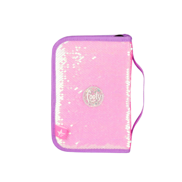 Cartuchera call me de 1 compartimiento con su frente con apliques bordados y de toalla con una estampa sublimada. Tiene 1 bolsillo, 1 solapa desplegable con capacidad para 24 lápices y en la parte trasera tiene lentejuelas brillantes.