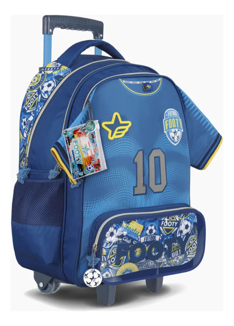 Mochila con 3 compartimientos principales grandes, un bolsillo frontal y 2 bolsillos laterales para botella de agua con red, reforzados abajo con frente con camiseta de futbol y pantalla con mooving patch de gol. Estampa sublimada con logo Footy con tiras reforzadas y manija de agarre. Además tiene 2 ruedas y 2 topes.