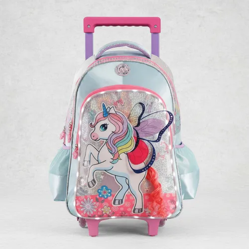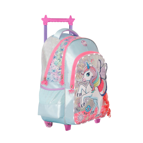 Mochila con 2 compartimientos grandes, 1 bolsillo frontal holográfico con estampa de unicornio y apliques de alas y cola para jugar, 2 asas ajustables acolchonadas, 1 manija de agarre, 2 portabotellas elásticos con red en los laterales, 1 cartel identificatorio,1 llavero de footy y viene con dos ruedas y 2 topes.