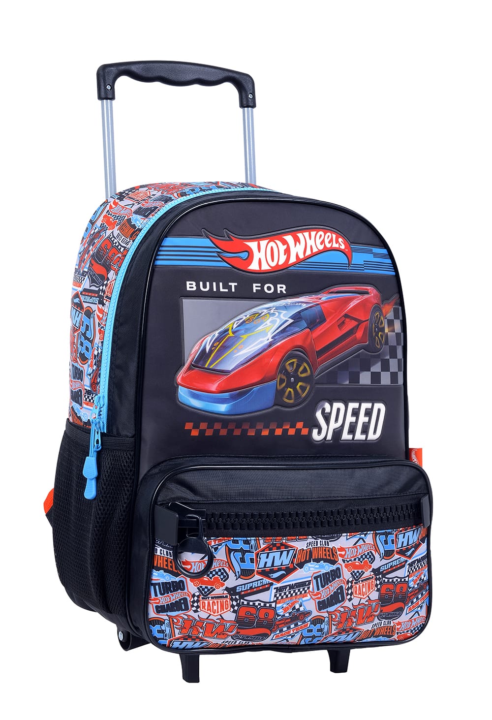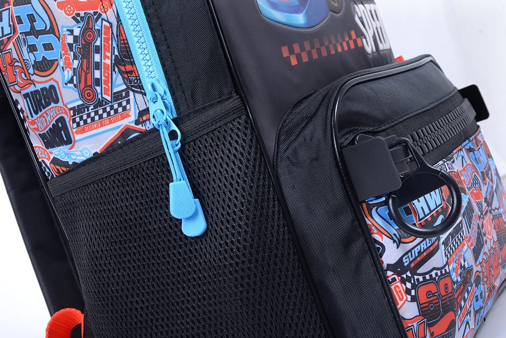 Mochila hotwheels original viene con una reparticion grande con dos cierres, 1 bolsillo frontal chico con un cierre grueso, 1 portabotella elásticos con red en el lateral, 2 asas acolchonadas ajustables, 1 cartel para identificar la mochila y viene con dos ruedas y dos topes.
