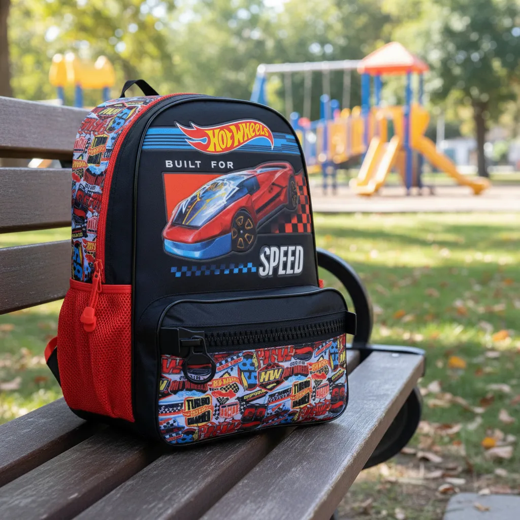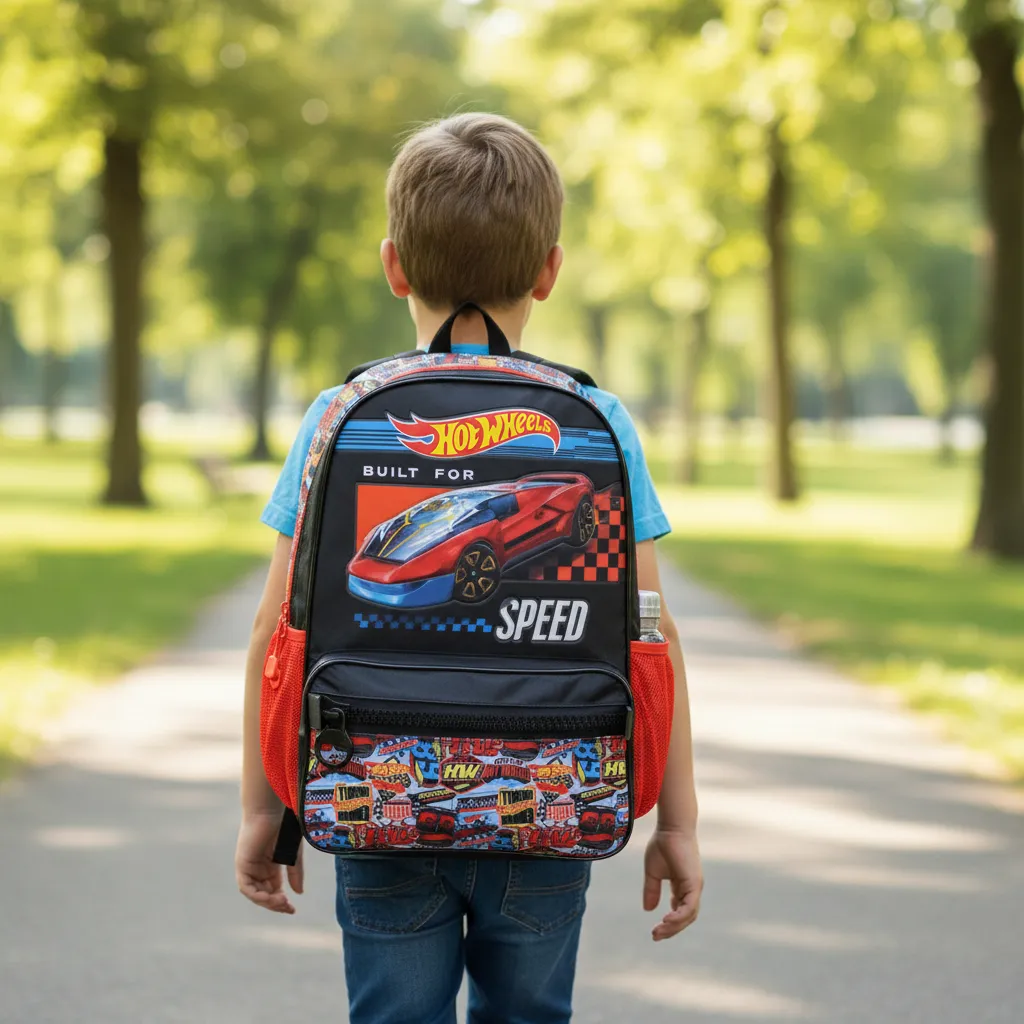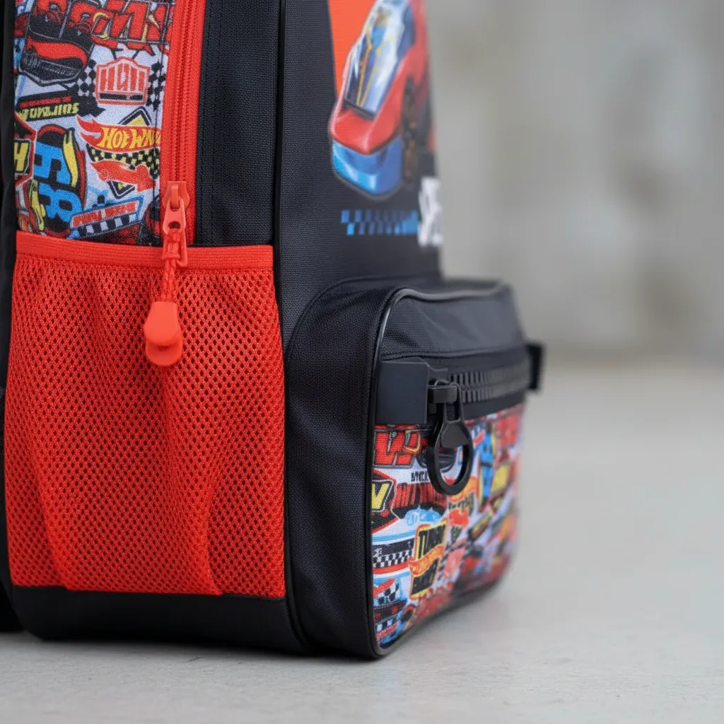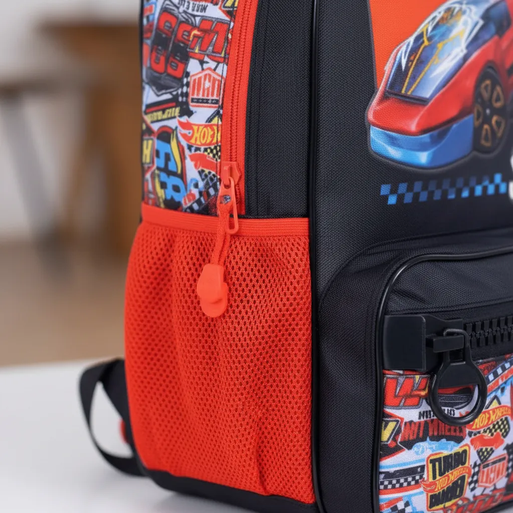 Mochila hotwheels original viene con una reparticion grande con dos cierres, un bolsillo frontal chico, 1 portabotella elásticos con red en el lateral, 2 asas acolchonadas ajustables y 1 cartel para identificar la mochila.