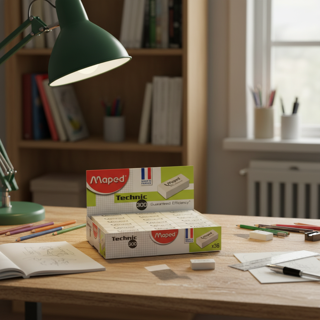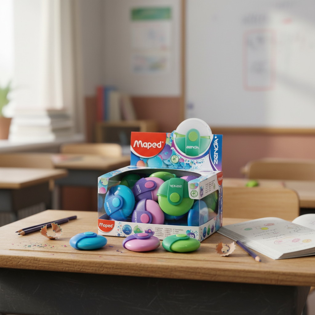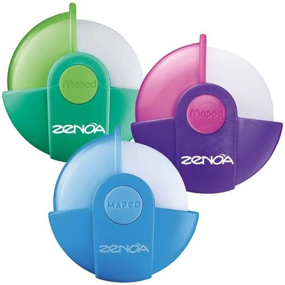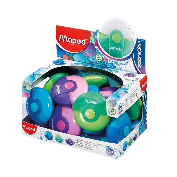 Goma con práctico estuche plástico de protección que mantiene siempre limpia la goma. Su forma circular otorga un borrado sencillo y un desgaste uniforme de la goma.